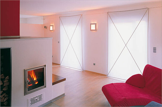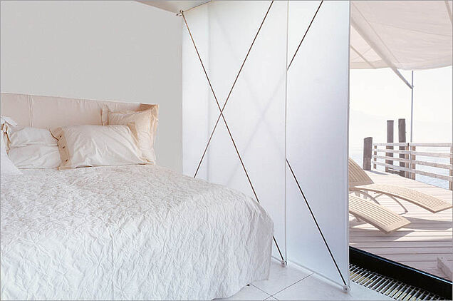 Zwei zu einem X verbundene Stangen aus Edelstahl, bespannt mit Ballonseide, ergeben sehr leichte Schiebeelemente, die als Raumteiler, Schrankfronten oder Sichtschutz eingesetzt werden können.